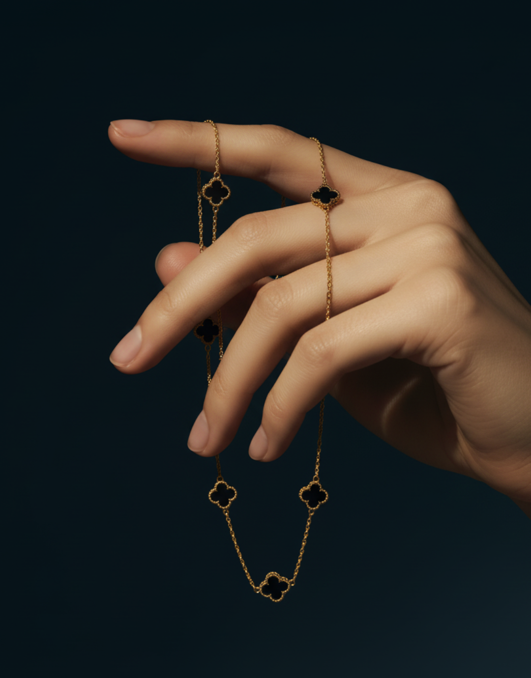 Cada detalhe foi pensado com delicadeza: o contraste do ouro dourado com o negro intenso dos trevos cria uma presença marcante, impossível de ser despercebida.